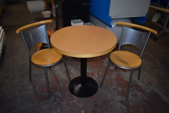 *70cm Circular Lightwood Topped Table on Black Pedestal with Two Chairs