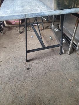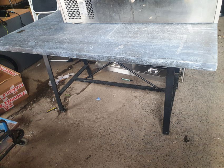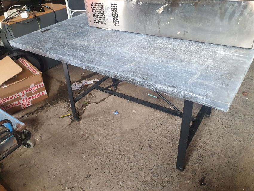 * Industrial style table with metal base and lead covered top. 1600w x 900d x 800h