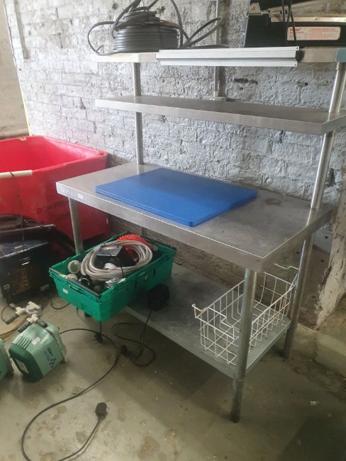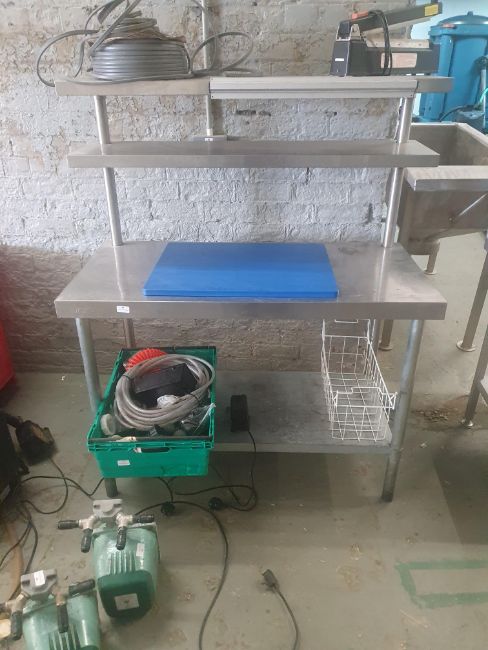 * S/S prep bench with under shelf and 2 x oversheves, complete with tab grab. 1200w x 600d x 1460h
