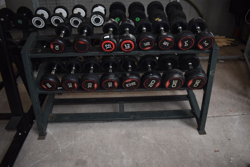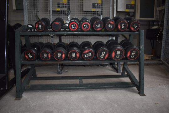 *Eight Pairs of Jordon Rubber Covered Dumbbells; 1x 10kg, 2x 12kg, 1x 14kg, 1x 16kg, 1x 18kg, 1x 20kg, and 1x 30kg with Rack