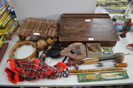 Child's Desk and a Musical Instruments, Toy Bagpipes, etc.