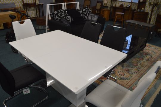White Dining Table with Four Black and Two White Leather Chairs on Chrome Frames