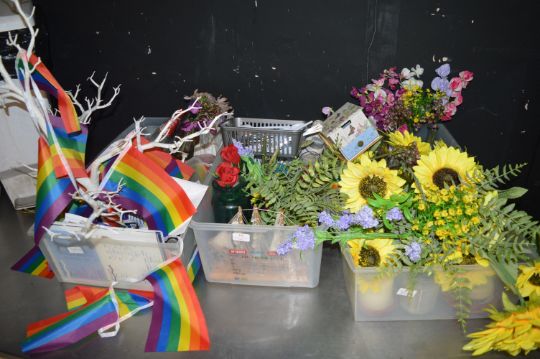 Three Plastic Trays of Artificial Flowers, Pride Flags, and Other Decorative Items