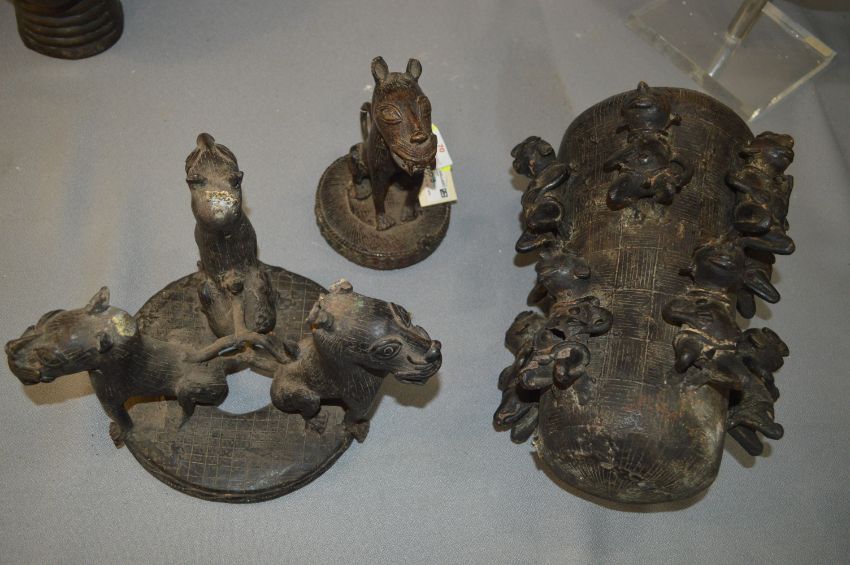 Large Benin Bronze Lidded Vessel on Three Dogs with Dog Lid and Human Figures 64cm high (damaged in transit, requires restoration to base supports)