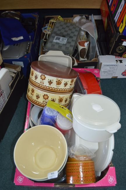 Two Boxes of Kitchenware, Utensils, Pottery, Storage Boxes, etc.