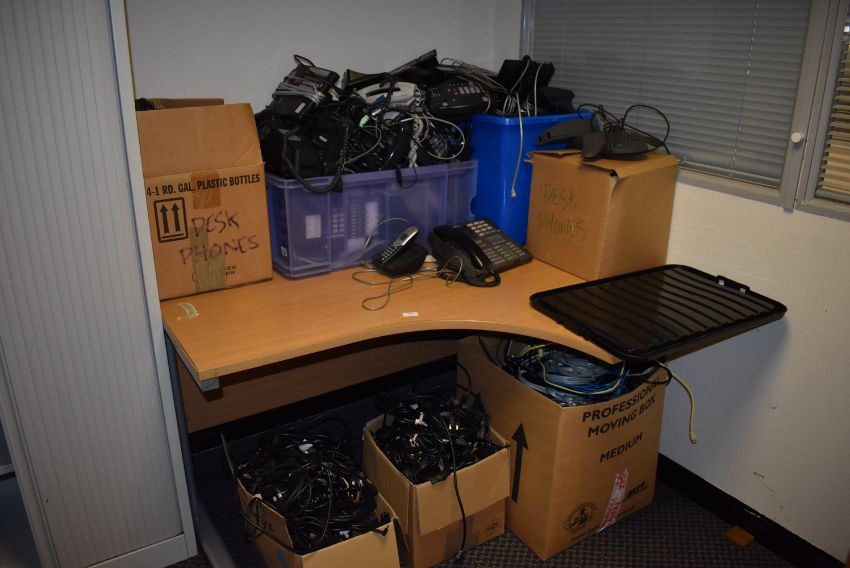 *Curved Desk and Quantity of Boxes Containing Cables, Assorted Telephones, etc.