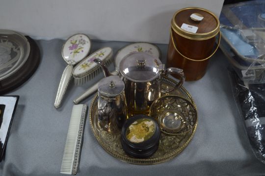 EPNS Tray, Coffee Pots, Dressing Table Set, and a Musical Biscuit Barrel