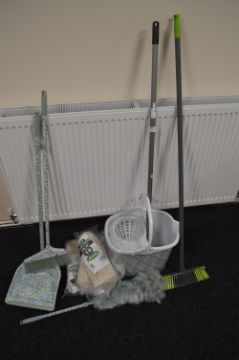 *Mop Bucket, Brush, Duster, Five New Steel Clip Mop Heads Size: 18, and a Scoop & Brush