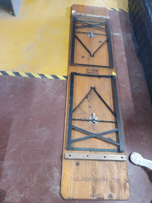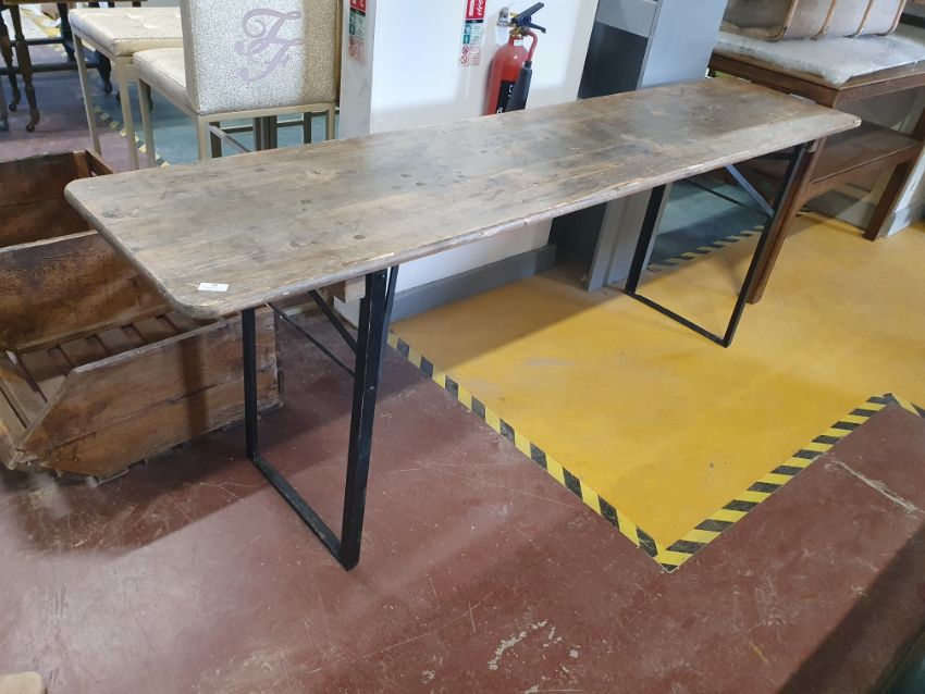 * Vintage wooden topped table with folding metal legs. 2200w x 500dd x 780h