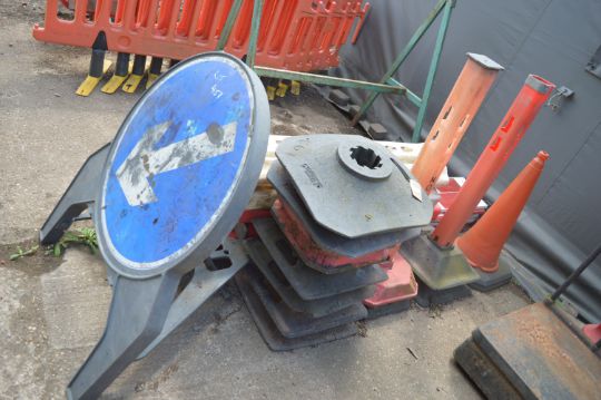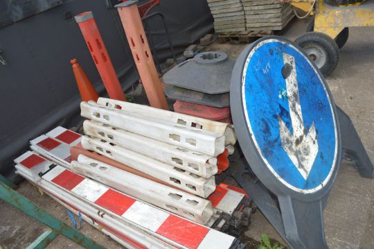 Collection of Posts, Barriers, and a Directional Sign