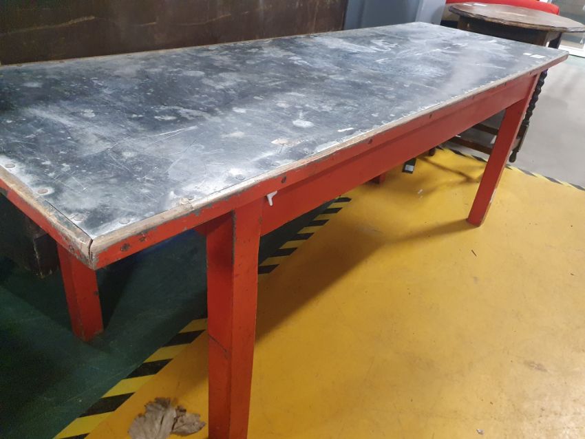 * Vintage lead topped low level table with an interesting patina and rivett details- 1800w x 600d x 650h