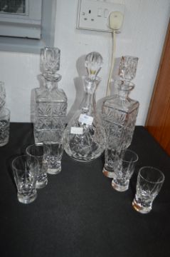 Three Cut Glass Lead Crystal Decanters plus a Set of Six Glasses