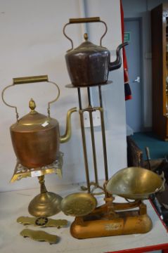 Vintage Kitchen Brassware Including Kettles, Stands, Scales, etc.
