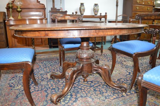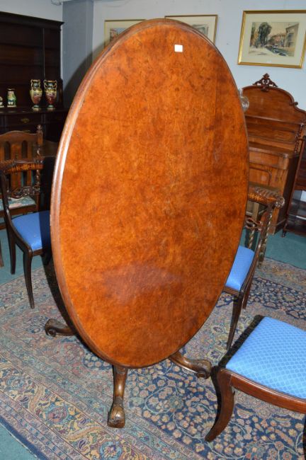 Mahogany Tilt Top Oval Dining Table with Burr Walnut Veneer and Four Matching Inlaid Chairs