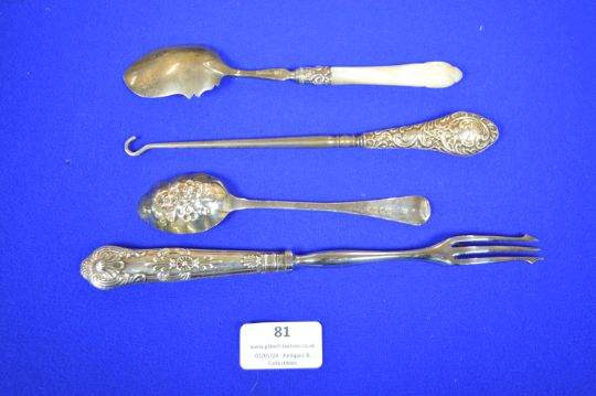 Silver Handled Pickle Fork, Button Hooks, and Spoons