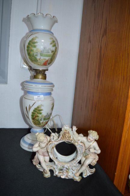 Electrified Hand Painted Glass Oil Lamp, and a Continental Porcelain Clock Surround