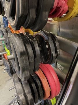 Jordon’s Weight Rack with Quantity of Various Rubber Coated Plates, Thirty-Three Barbell Weightlifting Bars, and a Quantity of Clips