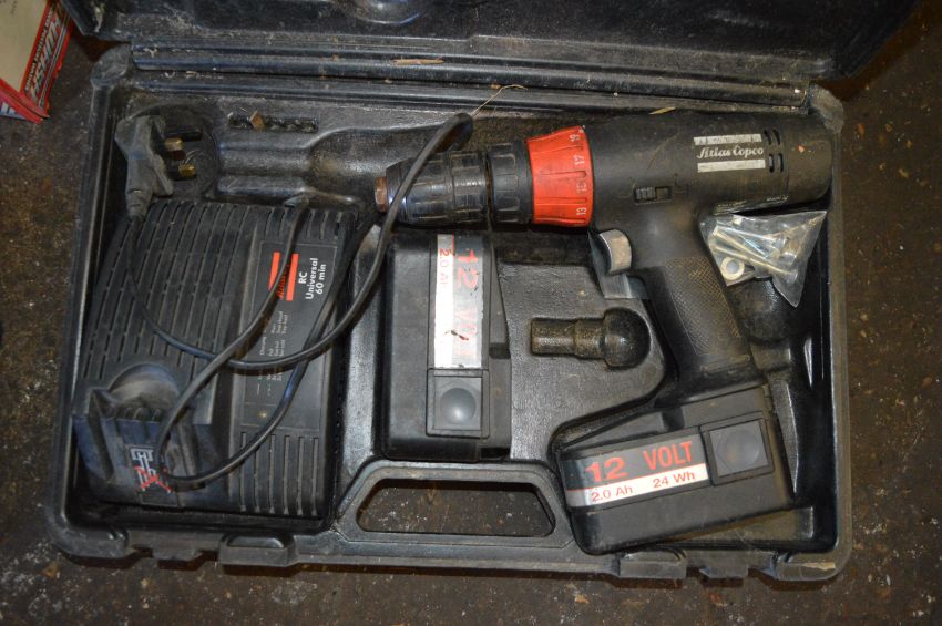 Atlas Copco Cordless Drill with Two Batteries, Charger, and Case