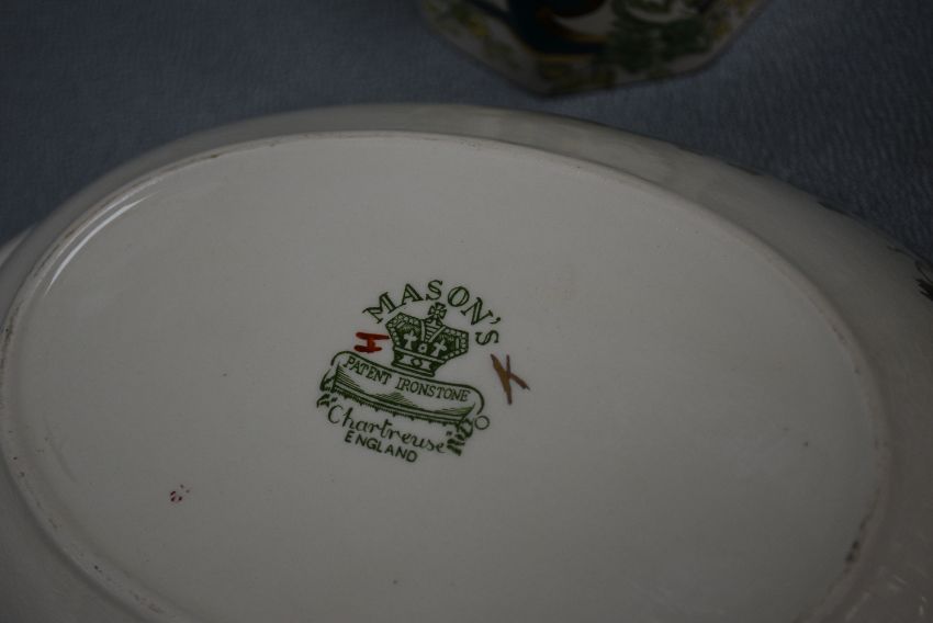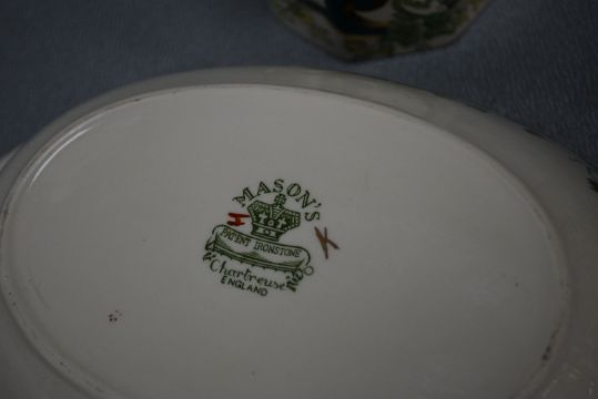 Masons Chartreuse Pattern Jugs, Dishes, Clock, plus Three other Jugs