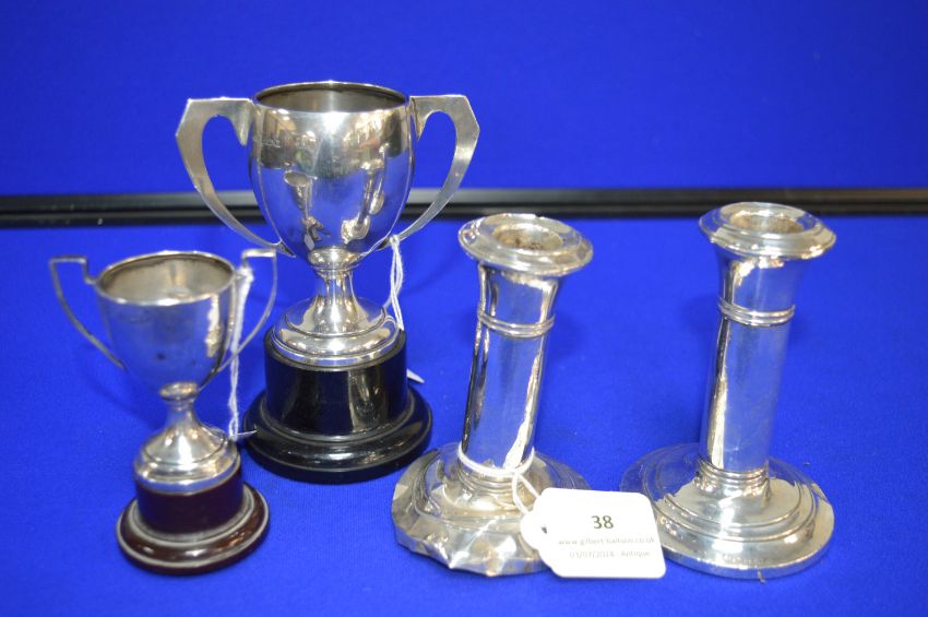Pair of Small Silver Candlesticks (filled) and a Pair of Silver Trophies 88g total (sold a scrap)