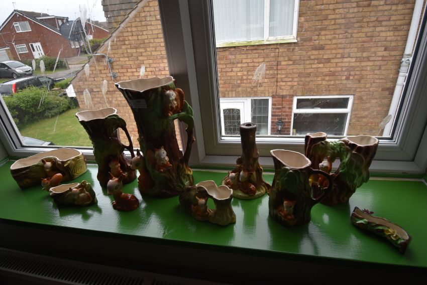 Collection of Withernsea Ware Pottery Vases and Flower Holders with Fauns, Squirrels, and Rabbits