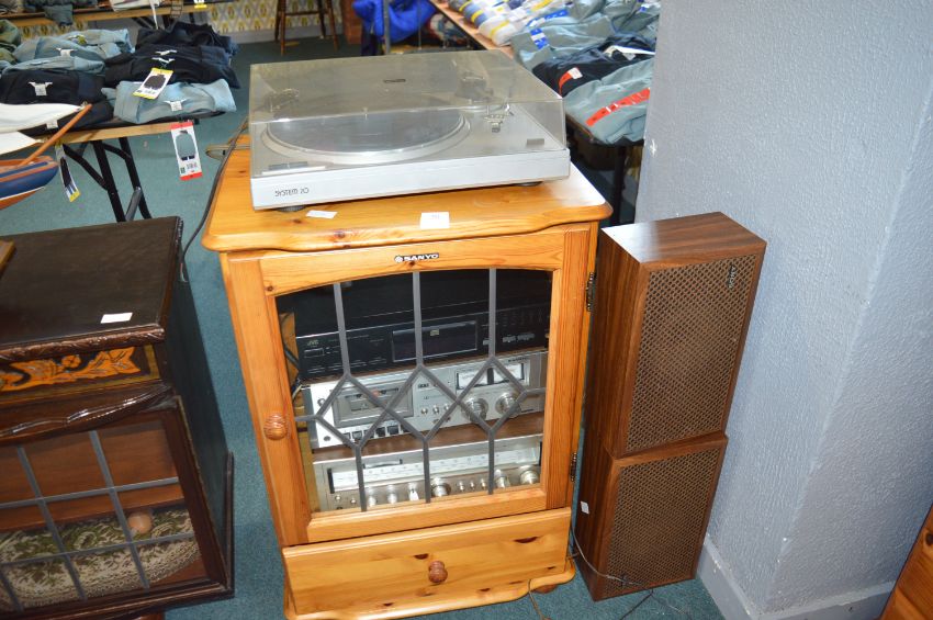 Pine Audio Cabinet with Assorted Hi Fi , and Sony Speakers