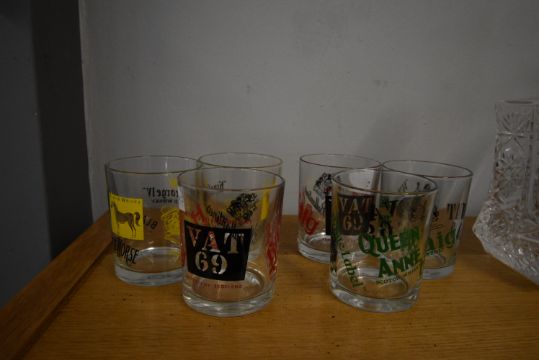 Glass Decanter, Bowl, and Six Vintage Whisky Tumblers