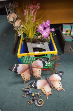 Box of Artificial Flowers, Metal Wall Art, and Vases, etc.