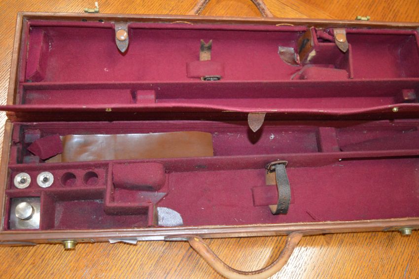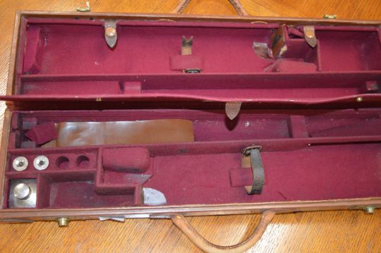 The V. C. Gun Case by E.J. Churchill Gunmakers of London Leather Bound Double Gun Case with Reinforced Corners, Fitted Interior, One Pair Snap Caps, and Gun Oil Container