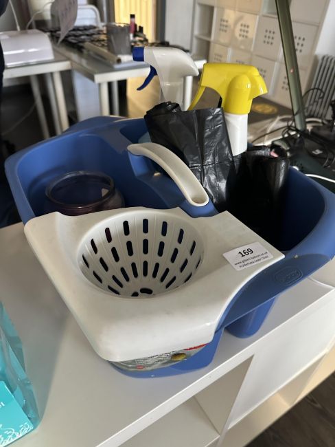 Janitors Caddy, Bing Bags, and Cleaning Solutions