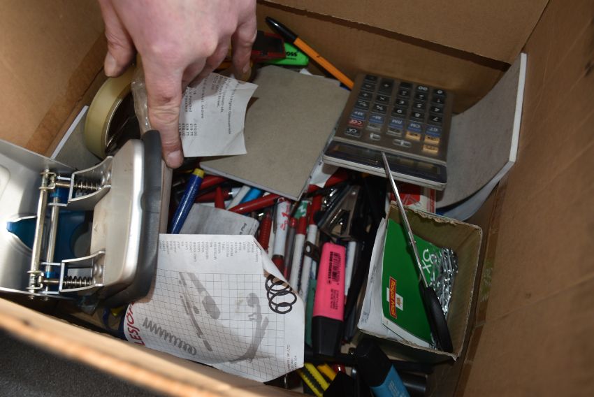 *Box of Stationery Including Pens, Punch, Calculator, etc.