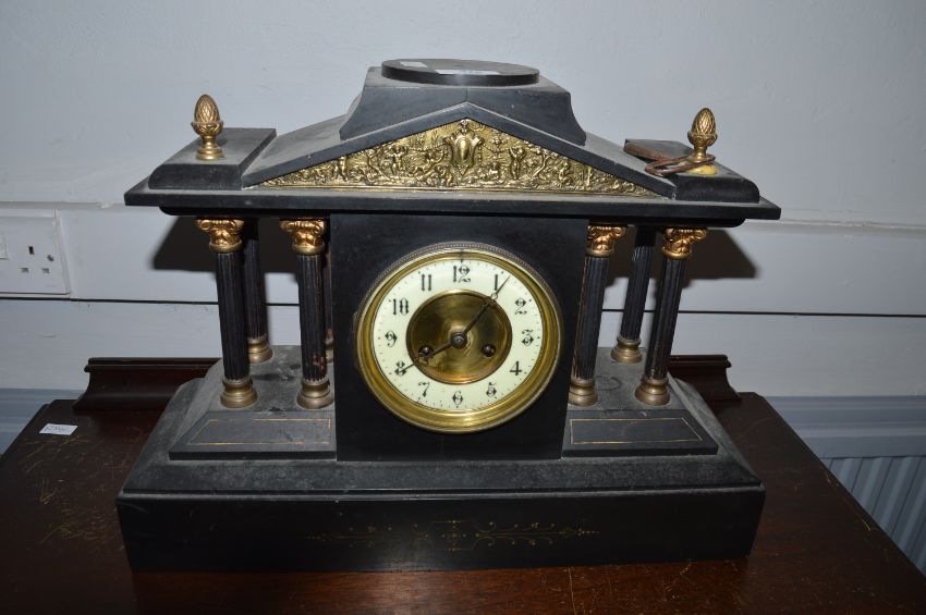Large Slate Mantel Clock with Classical Columns and Gilded Decoration (missing some features)