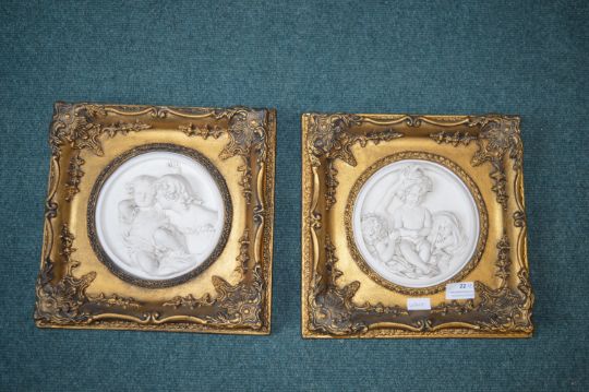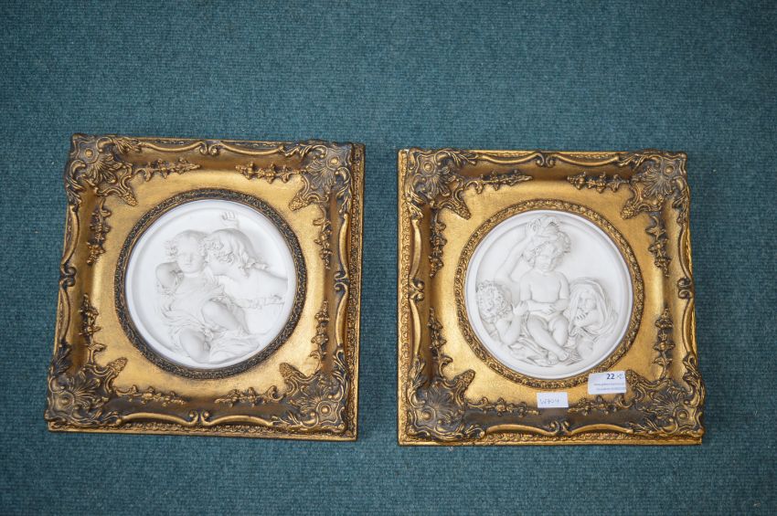 Pair of Gilt Framed Wall Plaque Featuring Cherubs