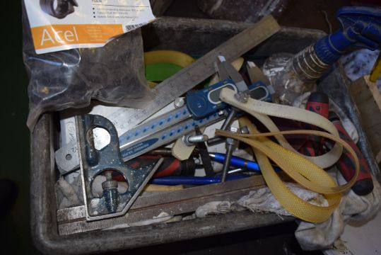 *Tub of Assorted Handles, Vernier Gauge, Steel Ruler, etc.
