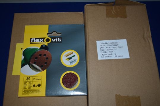 Two Boxes Containing 20 Packs of 6 Flexovit 125mm Sanding Discs 50 Grit