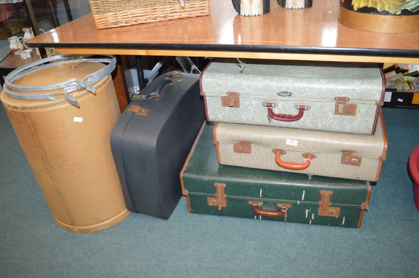 Four Vintage Suitcases and a Storage Drum