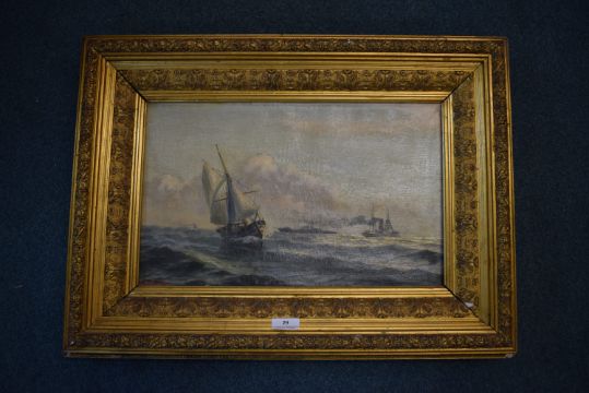 Classic Maritime Oil Painting "Sailboats and Steam Ships on a Choppy Sea under Dramatic Sky" (Late 19th/Early 20th Century) Signed Otto Schmitt, Size: 17" x 10.5"