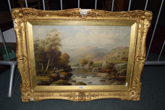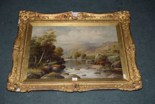 Oil on Canvas Island River Scene with Figures Fishing by William Henry Mander 1850-1922, Size: 20" x 30" in Gilt Frame, One of a Series of Three