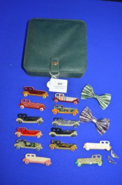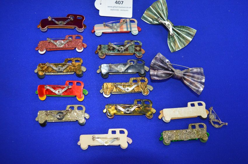 Thirteen Lea Stein 1960’s Car Brooches, plus Two Bows (two cars missing pins), Marked “Paris” Made of “Rhodoid” Cellulose Acetate Polymer