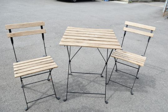 *Folding Metal Framed Wooden Slat Garden Table & Two Chairs