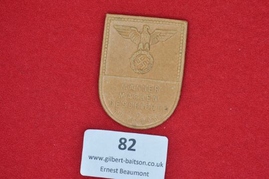A pressed card and composition badge in shield form, with raised eagle and swastika above the legend Männer Machen Geschichte – 17.11.1938.