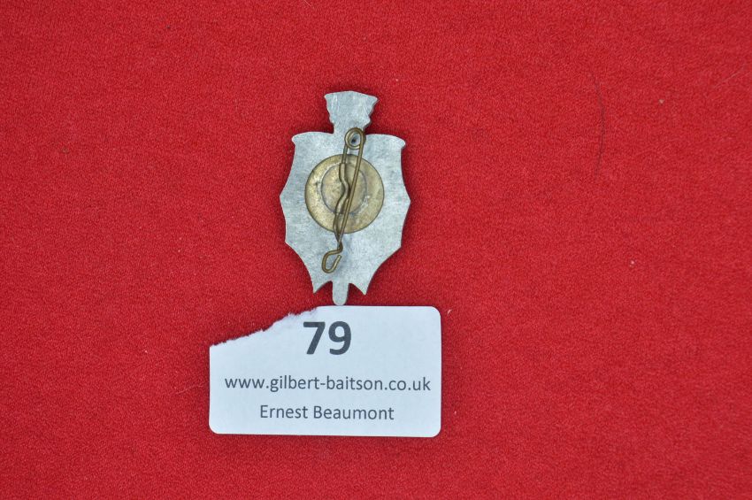A small die-struck aluminium badge in the form of a fasces over a shield with twin lightning bolts. Retains its original pin and securing plate to reverse.