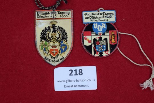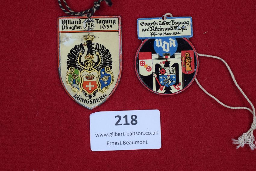 Two (VDA) “Deutscher Volksbund für das Deutschtum im Ausland” enamel event badges. - "Ostland-Pfingsten Tagung 1935, Königsberg," featuring a crowned German imperial eagle with heraldic shields, suspended from a twisted cord, and "Saarbrücker Tagung an Rhein und Mosel, Pfingsten 1934," with heraldic design, “VDA” legend above, and original cord suspension.