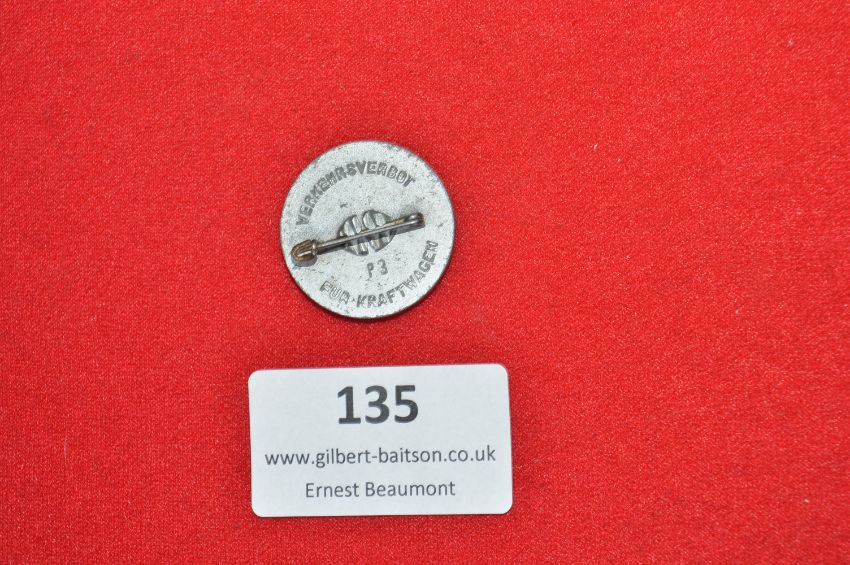 A German WWII civilian vehicle badge, circular with red border and silvered centre bearing the image of a motor car, denoting traffic prohibition for vehicles. Retains good detail, light wear to finish.