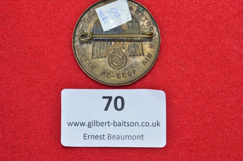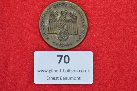 Circular brass Winterhilfswerk badge for the 1933–34 campaign, featuring the national eagle above a swastika, surrounded by the legend "Wir kämpften gegen Hunger und Kälte" (We fought against hunger and cold).