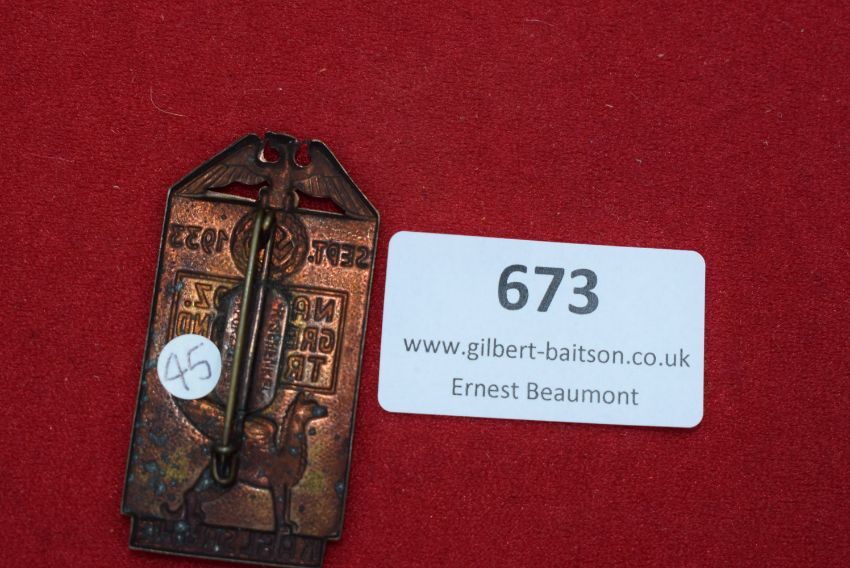 A rectangular bronze-coloured event badge with eagle/swastika above inscription “Nat.-Soz. Grenzlandtreffen Karlsruhe Sept. 1933”, featuring a winged griffin.