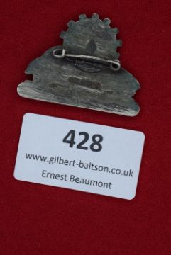 Pressed metal tinnie depicting VW car beneath cogwheel and swastika, inscribed “Grundsteinlegung des Volkswagenwerkes Mai 1938” (Laying of the Foundation Stone of the Volkswagen Factory, May 1938).