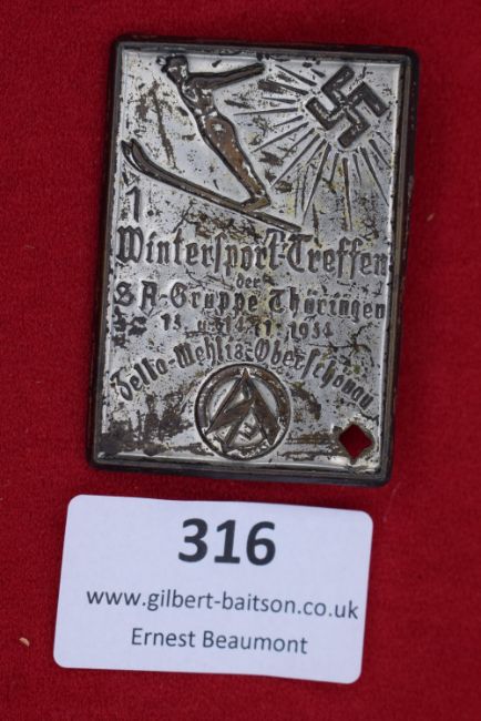 A rectangular pressed metal badge commemorating the 1st Winter Sports Meeting of SA-Gruppe Thüringen, held at Zella-Mehlis / Oberschönau, 13–14 January 1934. Depicts a ski jumper with sunburst swastika above and SA emblem below.