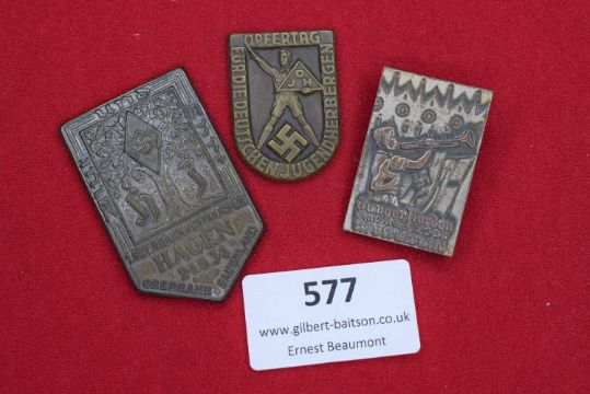 Two Hitler Youth Day/Event Badges, both circular, pressed alloy types, one painted blue, depicting an alpine youth hostel with legend Adolf Hitler Jugendherberge; the other greyed, with similar Jugendherberge motif and inscription.