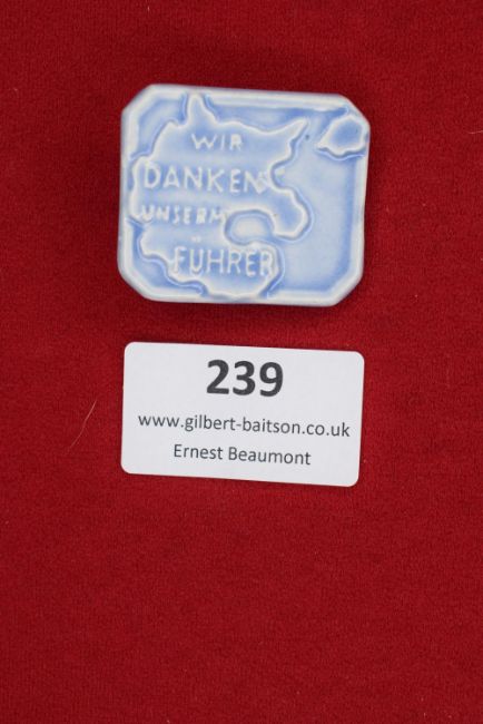 Third Reich era glazed ceramic badge “Wir danken unserm Führer” (“We thank our leader”) with original pin fitting.